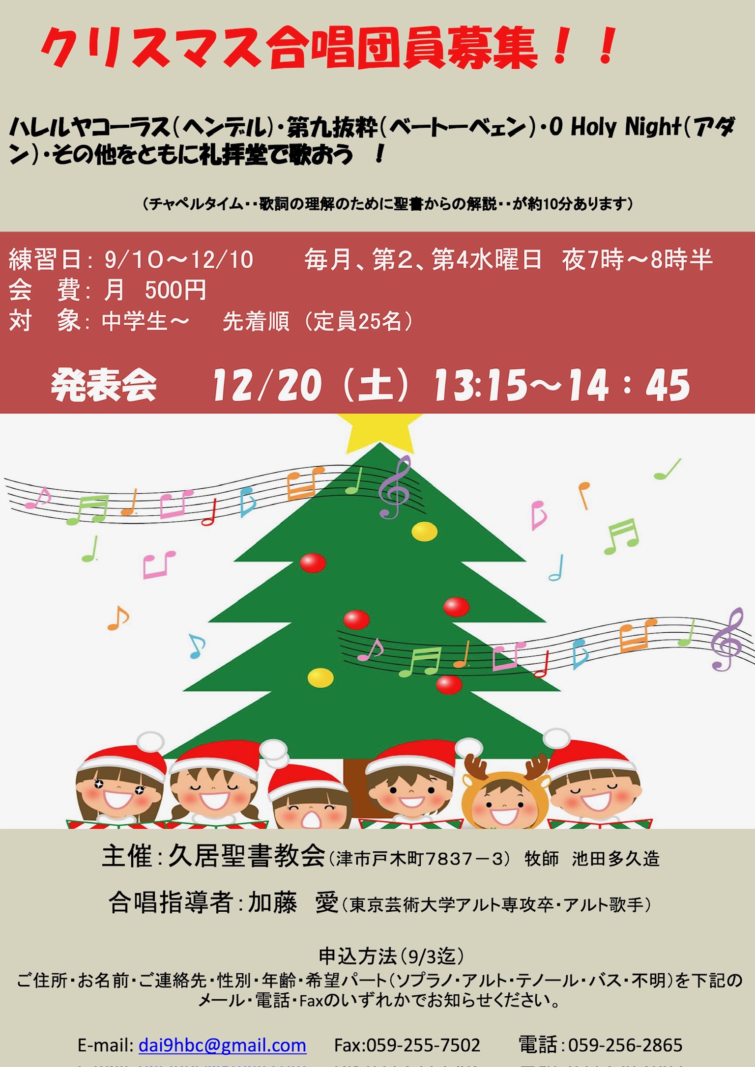 | 会場:久居聖書教会(三重県久居市) 入場料:無料(席上献金なし) G.F.ヘンデル作曲 「ハレルヤコーラス」(オラトリオ「メサイア」より) L.v.ベートーヴェン作曲 交響曲第9番・ニ短調・作品125「合唱付き」 他 指揮:加藤愛 ピアノ:馬原美歌 合唱:久居聖書教会クリスマス合唱団 【主催】 久居聖書教会 |