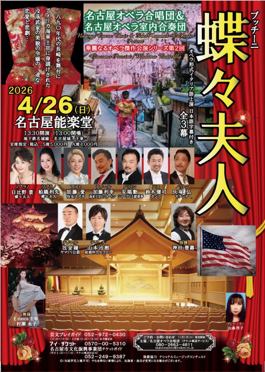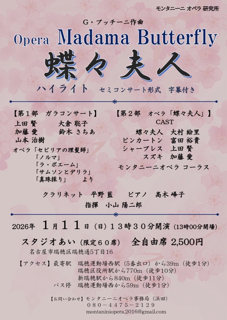 | 会場:スタジオあい(愛知県名古屋市) 入場料:2500円(全自由席) チケットはこちらから 【演奏曲】 C.サン=サーンス作曲 オペラ「サムソンとデリラ」より「あなたの声に私の胸は開く」 オペラ「蝶々夫人」(ハイライト)スズキ役 【主催】 モンタニーニオペラ |