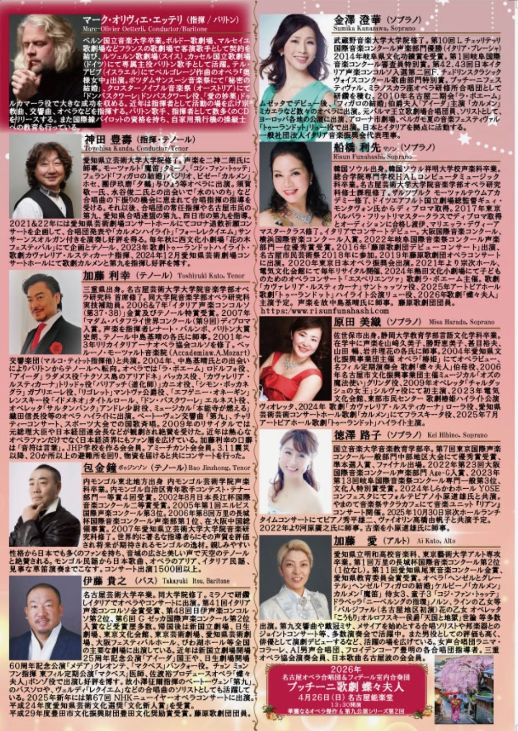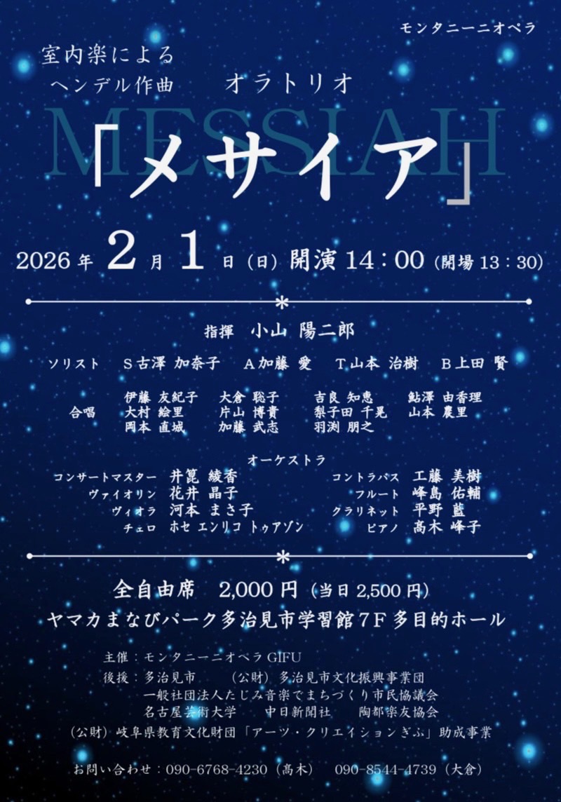 | 会場:ヤマカまなびパーク多治見市学習館7階多目的ホール(岐阜県多治見市) 入場料:2000円(全自由席) チケットはこちらから 【ソリスト】 ソプラノ:古澤加奈子 アルト:加藤愛 テノール:山本治樹 バリトン:上田賢 【主催】 モンタニーニオペラGIFU |